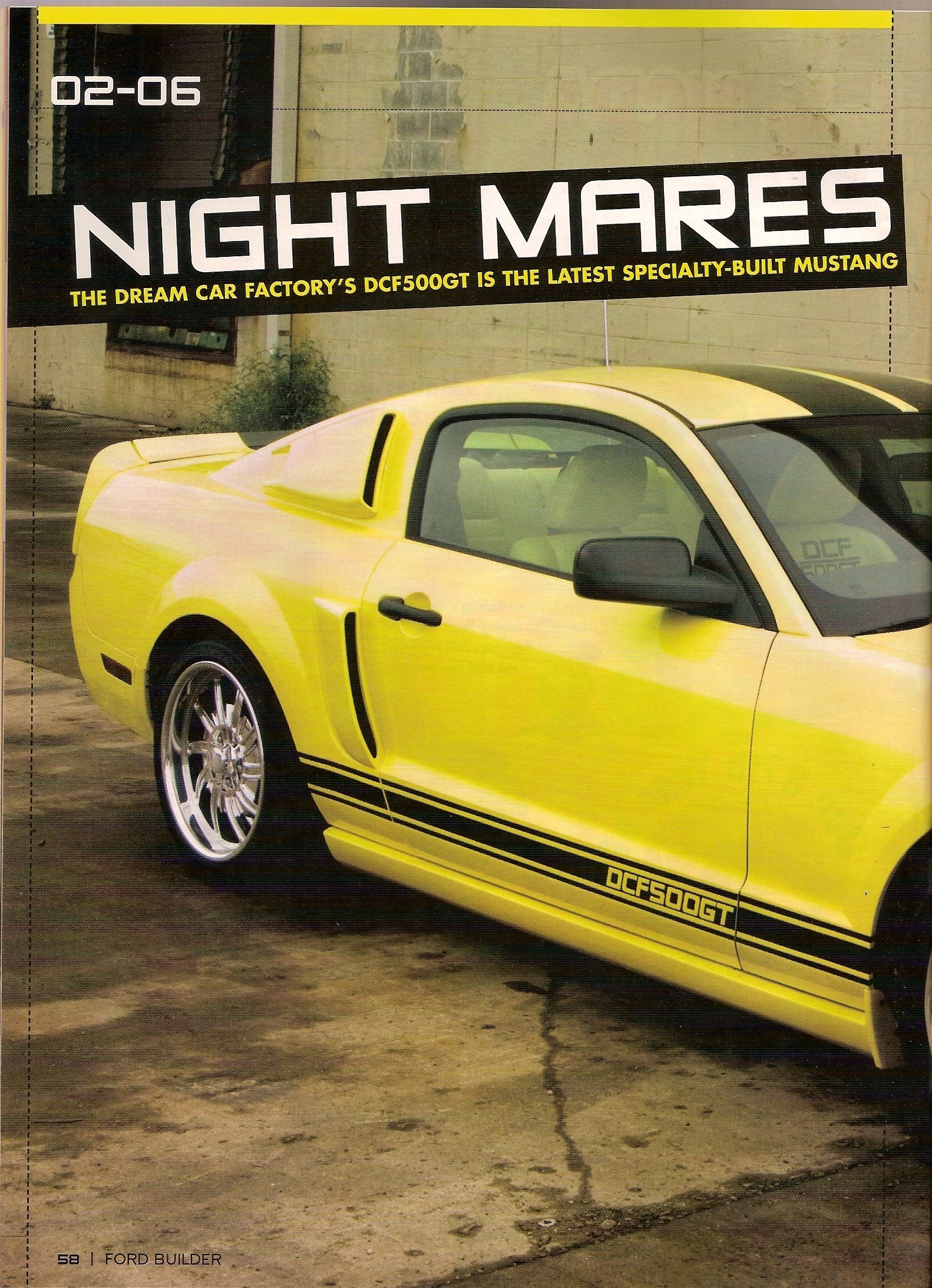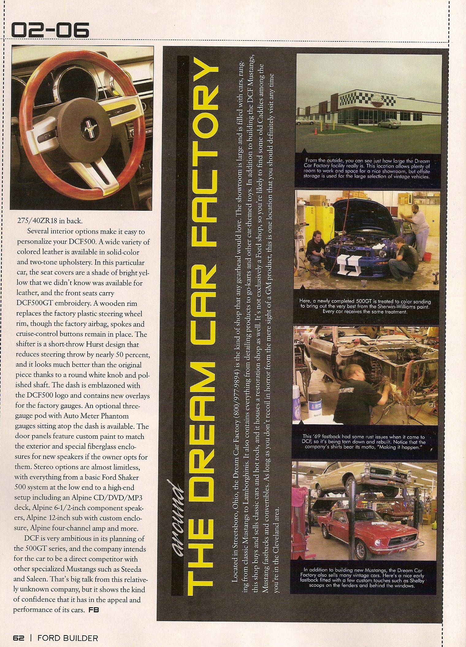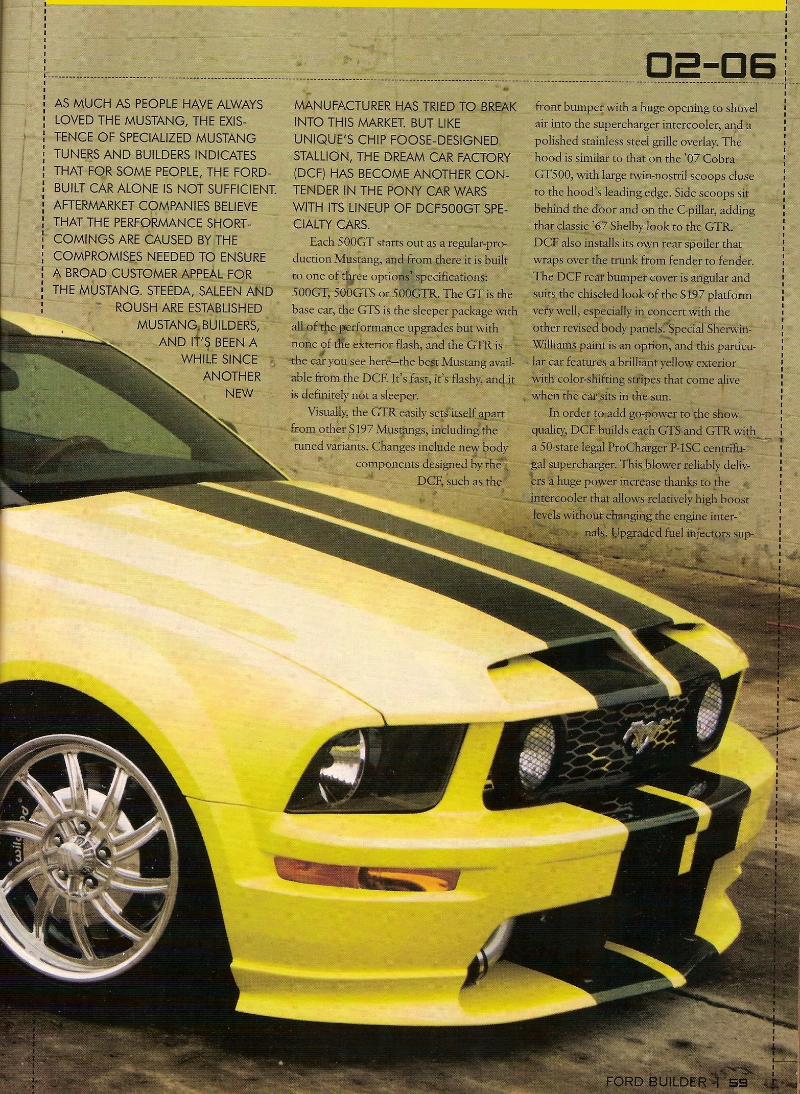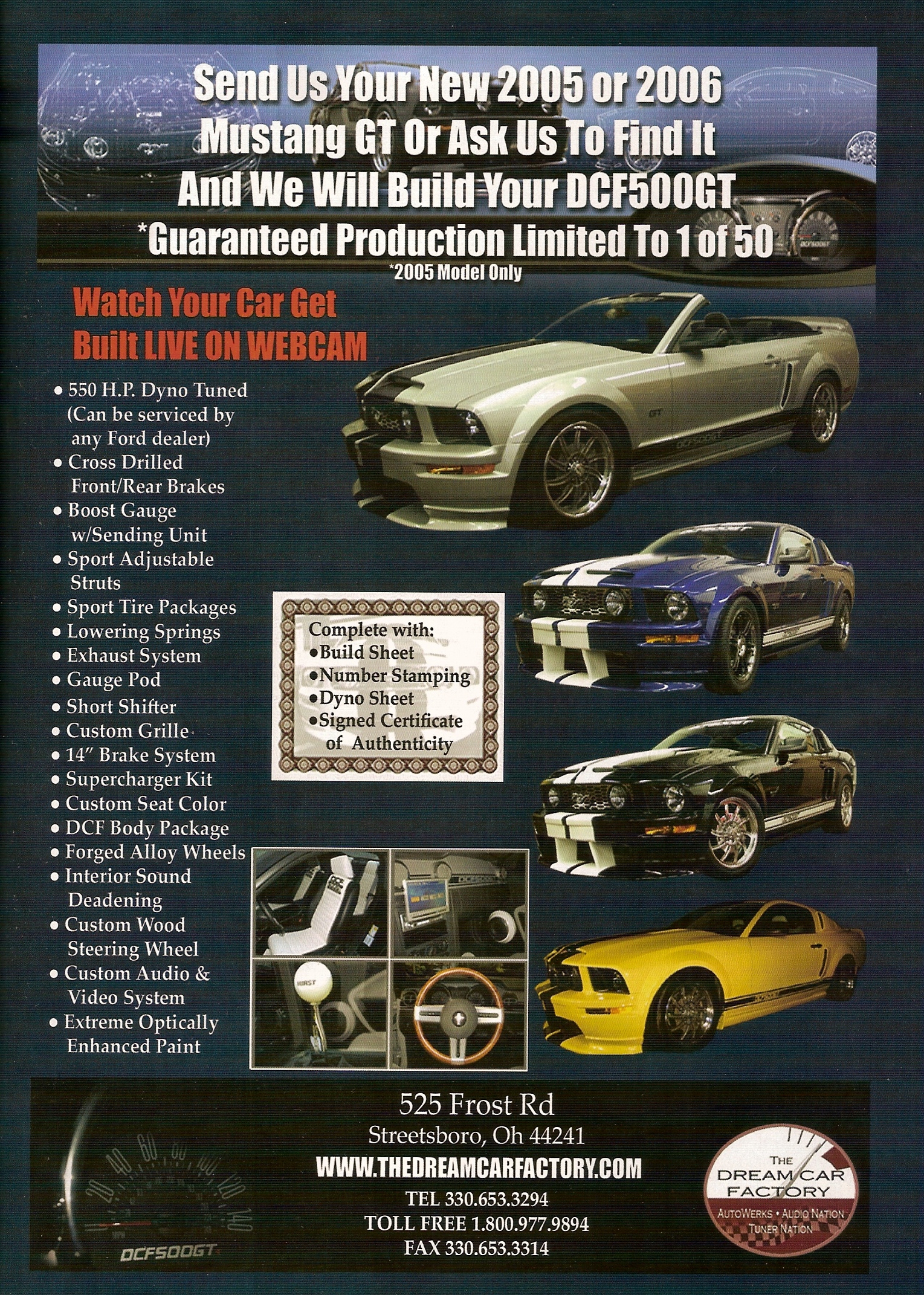 The Dream Car Factory, known originally known for making that restoration dream of yours come true then they made their mark manufacturing the DCF500. A car that competed against all of the top Mustang builders in the US like Saleen and Roush. Developing an aggressive body and then taking power levels to over 600hp with a warranty when others were stuck making 500hp. With 3 choices of the 500 it quickly made it to dealerships across the country. Giving the consumer the ability to customize it with loads of accessory options made it like no other Mustang offered.