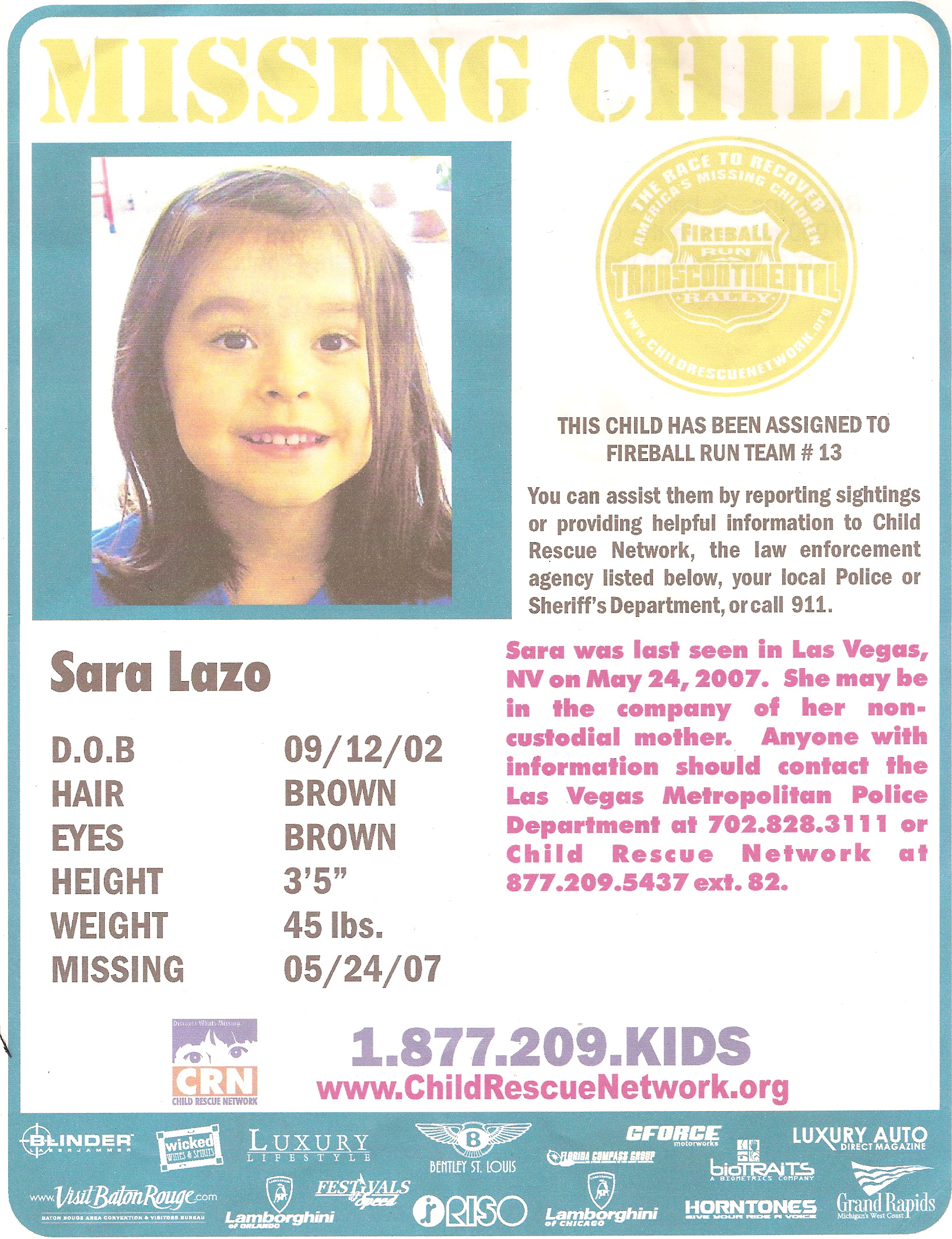 I first met the president of CRN, Jeff Griesemer during the 2007 Fireball Run Transcontinental Ralley. FBR chose this charity to help bring awareness to communities across the US about the organization and to help find missing children. After having a long talk with Jeff and hearing the statistics, I knew I had to help any way I could. During the Fireball Run, we passed out thousands of fliers with pictures of missing children on them and I know many of the Fireballers continued their search long after the ralley was over. Please take the time to checkout Child Rescue Networks site and find your own way to help Jeff and his staff help bring families back together!