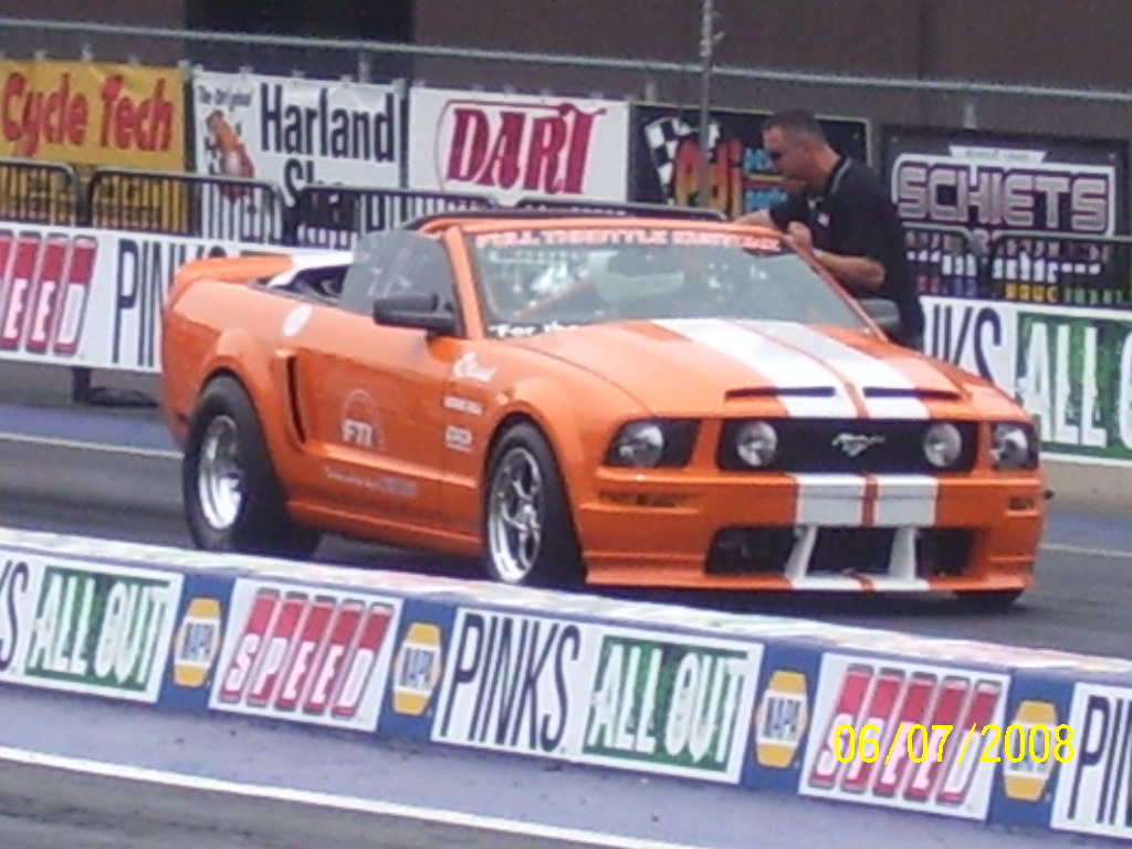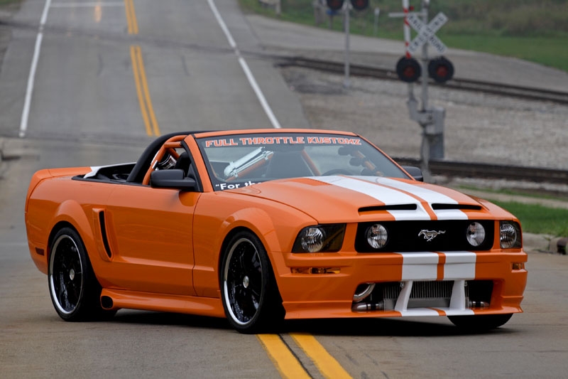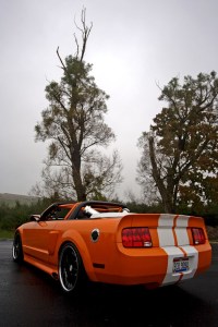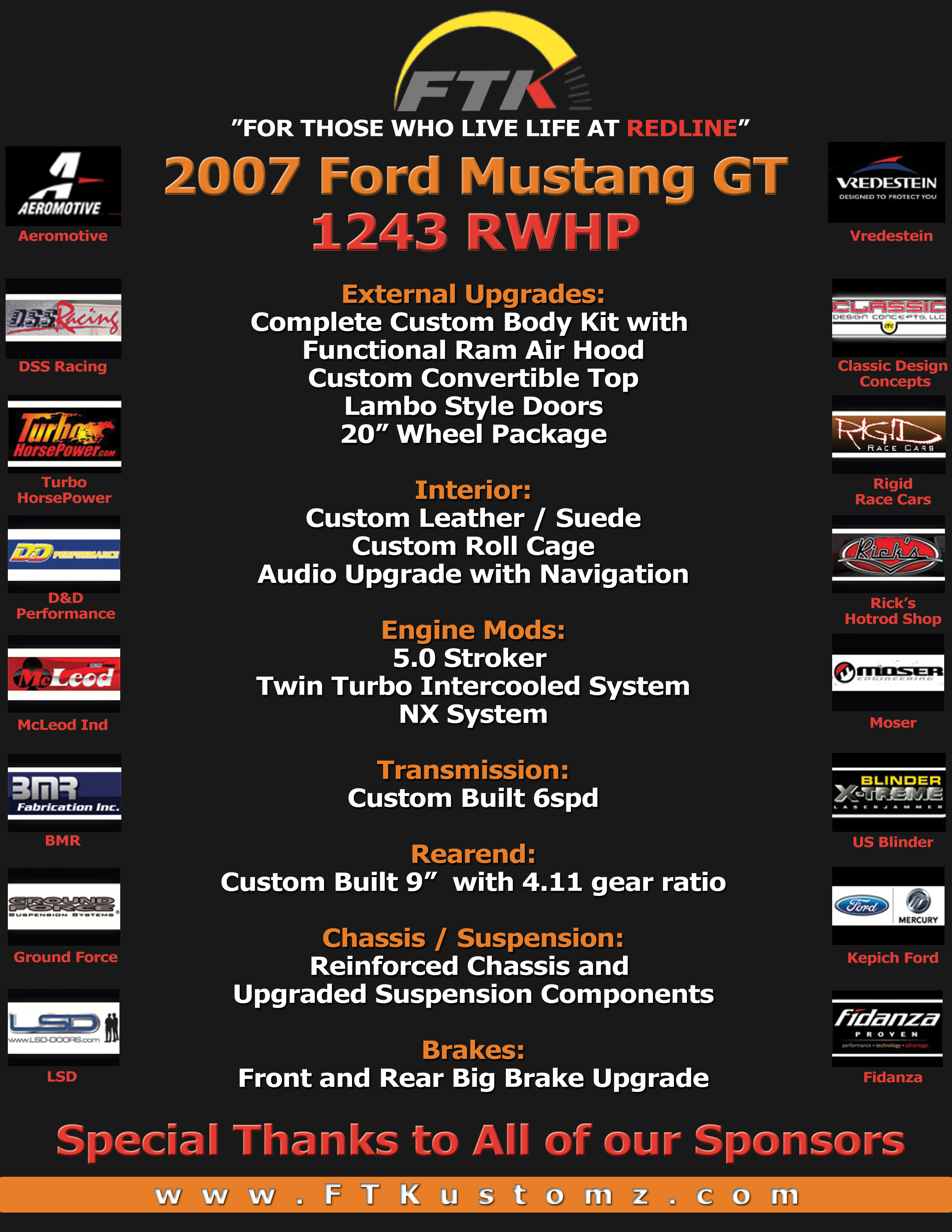 What started as a simple conversation of what car to build to represent the shop in 2007 ended up going way beyond what that conversation normally generates every year. This project was slated all because of a Muscle Mustangs article about the fastest street car in America which had all three categories under its belt…crazy horsepower for a street car, good looks for car show dates, and 1/4 mile drag times that made a statement. The bench mark to beat in hp was 897 and and still maintain driveability. This is why we chose a turbo & NOS combo so that sick power could be made and then when not squirting the laughing gas or creating crazy cylinder pressure the car could be somewhat docile. 6 weeks worth of hard work took a brand new triple black convertible Mustang GT and knocked the Muscle Mustangs fastest car out of the park. There was no short cuts taken on this car…there was no budget all because people said it couldn’t be done. Working closely with top manufacturers in the industry allowed this project and dream to come alive. The result was a stroked 3v motor with lots of prototype parts, twin 67mm ball bearing turbos, a custom intake manifold plumbed for direct port nitrous capable of delivering over 500hp itself, a custom prototype 6spd transmission (another thing people said could not be done) with special gear sets to handle all the torque about to be handed to the tires, a custom built 9″ with 40 spline axles, a complete upgraded fuel system that could supply more fuel than the motor could ever digest topped off with suspension and chassis work to keep the convertible from twisting like a pretzel. All of this had to beat the original goal of 1000hp set before beginning the build. Then came upgraded brakes, custom 3 piece wheels and a complete body kit that was aggressive yet stylish. Top that off with a color change to Tangerine with white stripes made this piece of art stand out in a crowd. And stand out it did….1243 rwhp and when cruising the car was capable of over 25mpg on the highway thanks to the boost controller and an unparalleled custom tune that made this car as fun on the street as a car with half its horsepower. Typically with cars capable of generating this kind of insane power are usually not very streetable and are far more work than fun to drive. that is why people never cruise these cars they just take them to a show and park them. Not with this car…it has been all over Florida, Michigan, Ohio, Pennsylvania, and up and down the coast of California from San Fransisco to Laguna Beach and out to Oakhurst. Setting a new benchmark for the performance world wasn’t easy or cheap, but as always, FTK pulled though with flying colors!