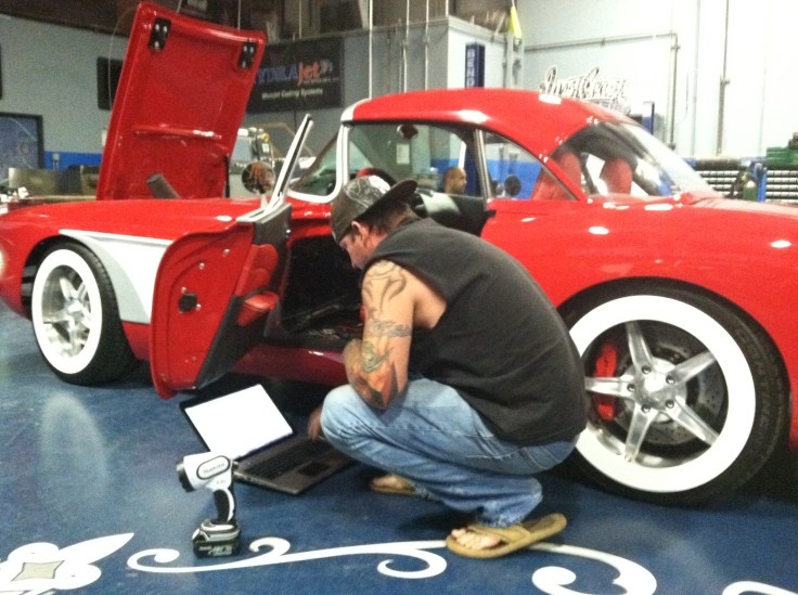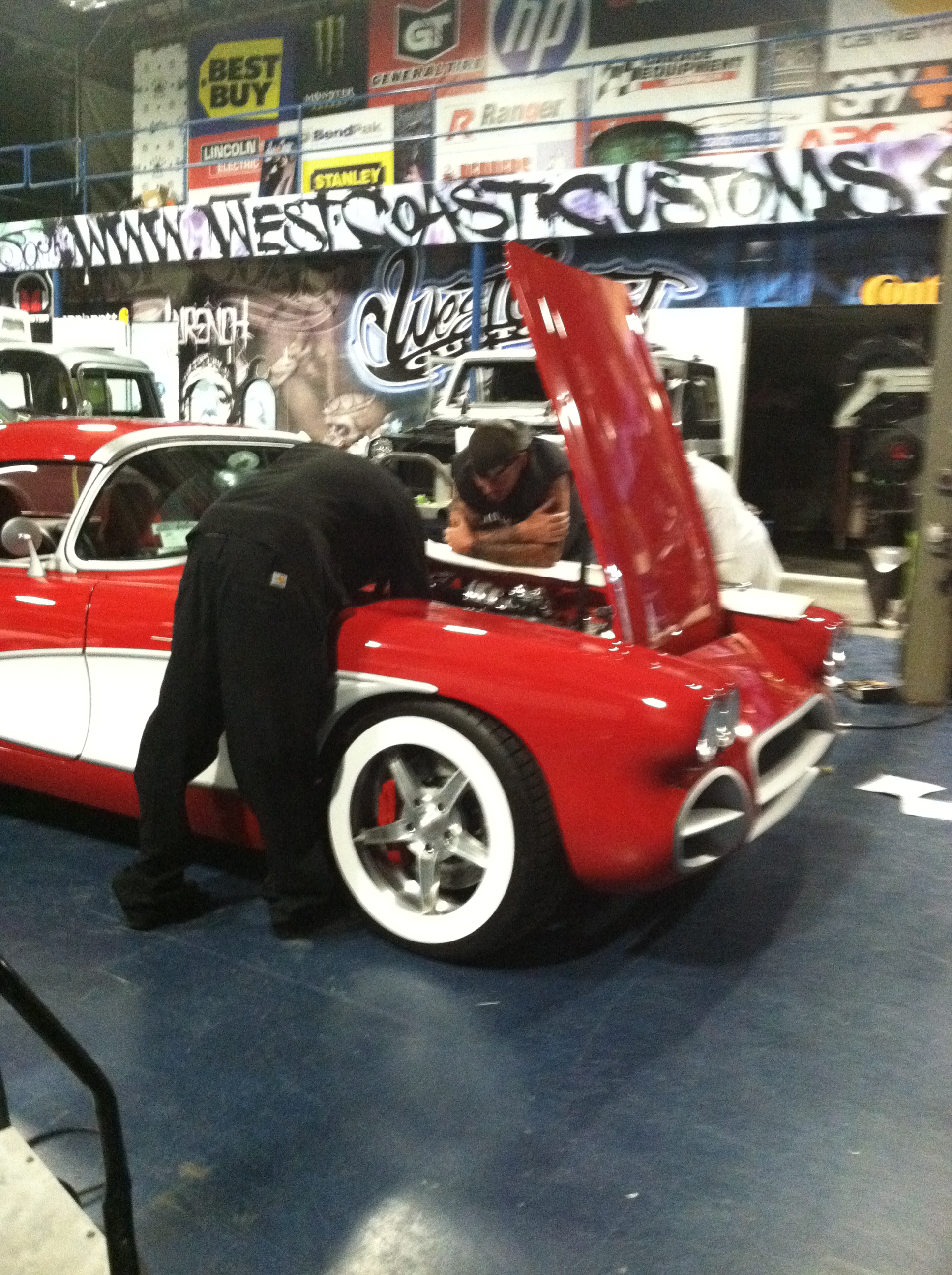 On one of my crazy adventures across the US to purchase another toy,(Turbo charged Pro Street Motorcycle) I was called by West Coast Customs on my way back from Wisconsin and they were supposed to deliver Will.I.Am’s 59 Corvette but it wouldn’t run correctly. After some diagnosing over the phone we narrowed it down to a spark plug wire that was arcing off the header and the VE table being off because of the intake they made. I finally made it to WCC at 2:30 am on Sunday evening to get her dialed in so the car could be delivered on Monday morning. If you know me then you know there is never a dull moment…even on road trips!