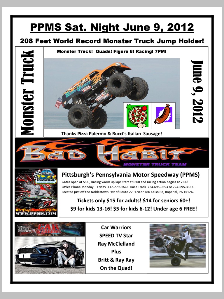 During my last visit back east I was invited by the Miley family (owners of PPMS) to hangout at the track, watch some dirt racing and see Joe Sylvester with his monster truck “Bad Habit” do some freestyle. Turns out a good friend of mine Mike Harris still races at the track as well. If you live in the Pittsburgh area, are a race fan and don’t frequent this race track then there is something wrong! PPMS always has events scheduled every weekend and it’s a great place to take the family and…. if by chance your kids are into monster trucks you may want to follow the “PPMS‘ schedule because they will be hosting a huge monster truck event soon!