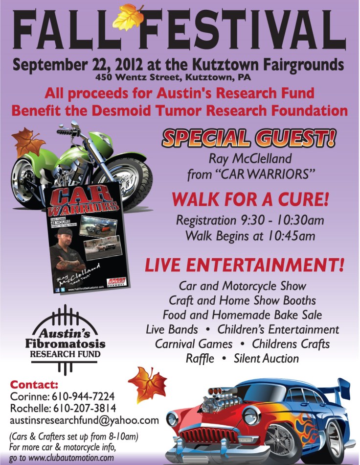 I was contacted by this young man who is a “Car Warrior’s” fan and we have exchanged emails for a couple months now. His name is Austin and he has had a battle on his hands since he was 10 years old…. it’s called a Desmoid Tumor. (Learn more about it here http://www.dtrf.org/ ) Every year his family holds an event to bring awareness and generate funds for the organization. Austin recently got his permit and is super excited to start driving once he passes the driving test. If you know me then you know the soft spot I have for children going through any challenges like this in life. No child should ever have to suffer nor should those around stand by and watch. When I learned of the date I tried to arrange my east coast trip around this event so I could attend, unfortunately the way the cards fell I would have to be in Pgh for 3 weeks. My sons 21st birthday is the weekend of the 9th and with the event two weeks