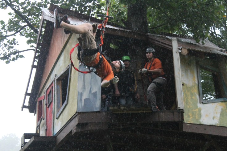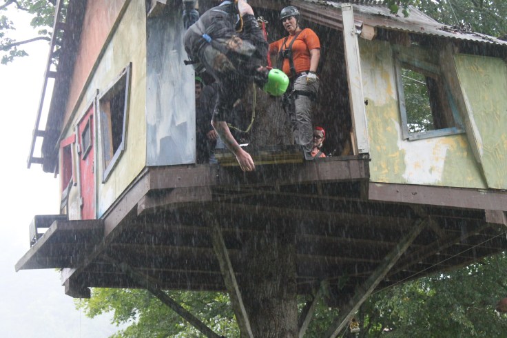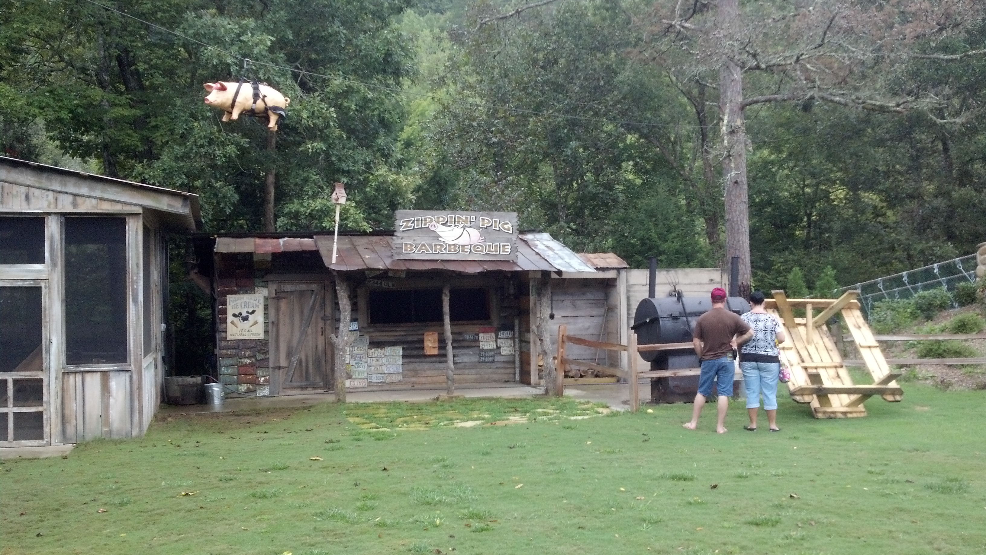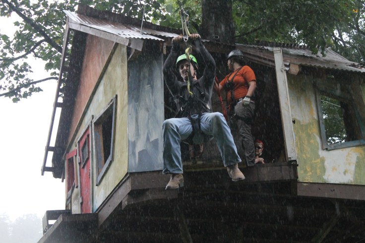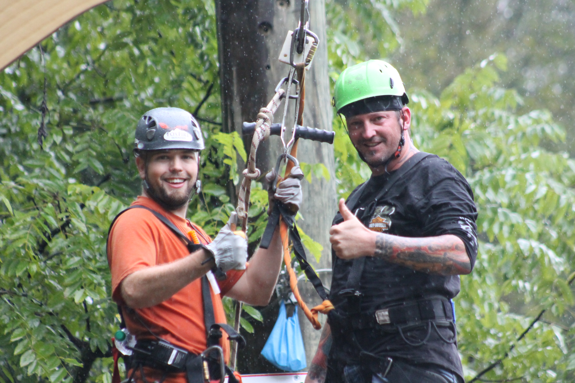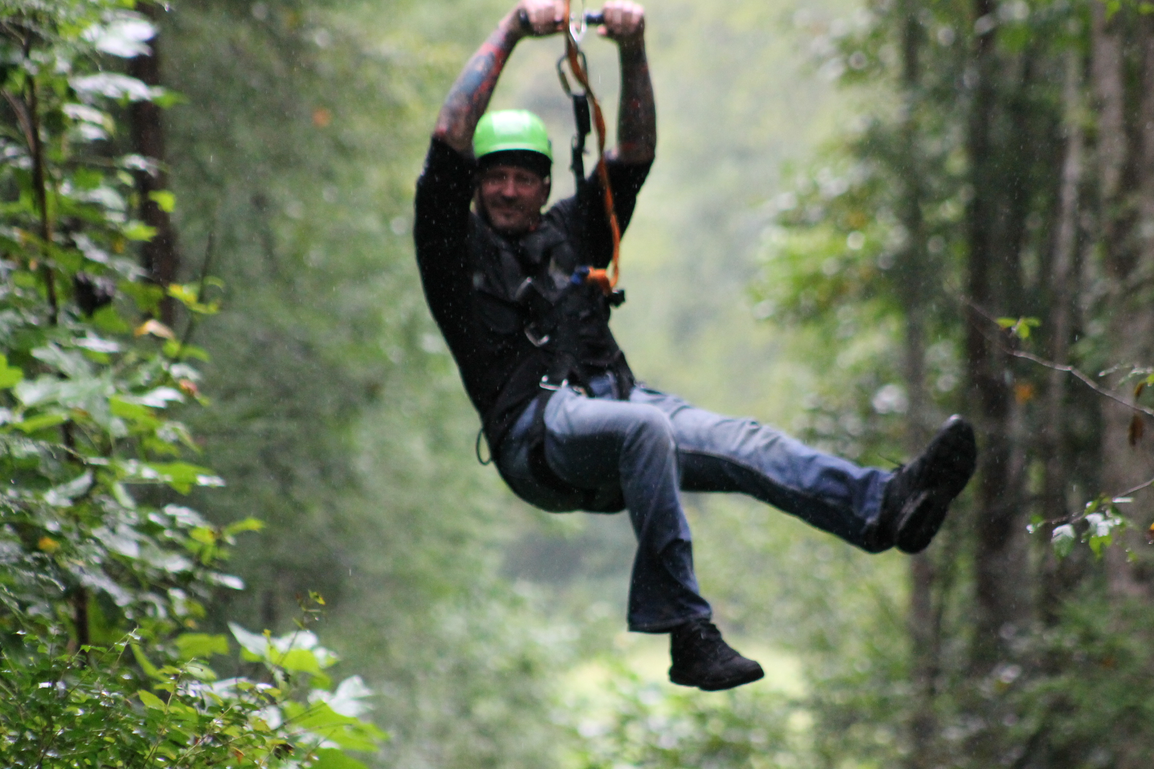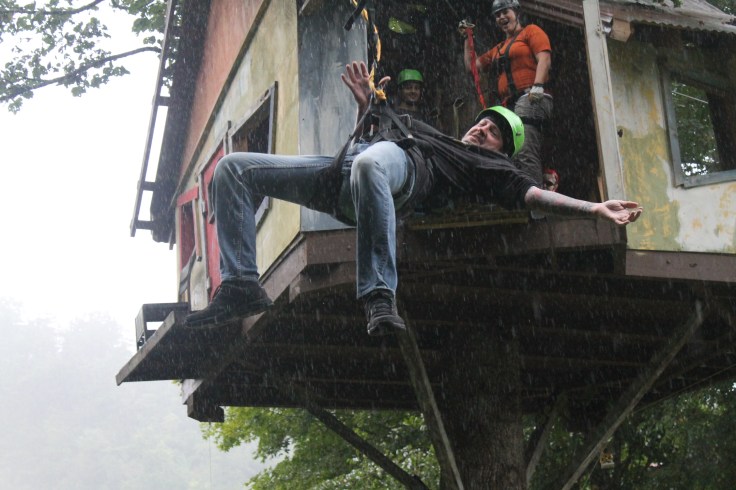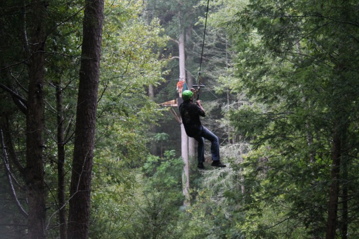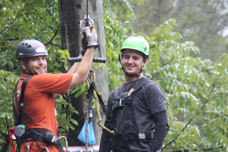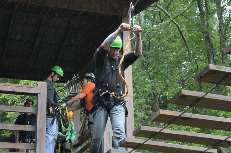 By the time we finished our atv ride it was starting to sprinkle rain so I was worried that the next leg of our adventure was going to be cancelled. Fortunate enough for us the rain didn’t matter to Fox Fire Mountain because as we waited to start the next adventure it started pouring pretty hard. I have never been on a zip line before mainly because I am not good with heights and no real control over what is about to happen…which is the main reason I won’t skydive, although I am reconsidering it now!